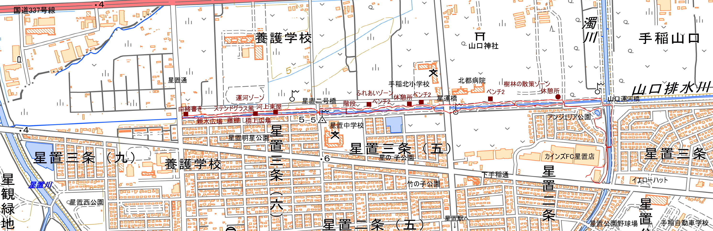 ポイント 運河は東西に、山口運河ゾーン、ふれあいゾーン、樹林散策ゾーンの3つからなっている。運河は国土地理院の地図では山口排水川と表示されている。更に濁川を越えて新川まで続く。積雪期の山口運河は別ページ |