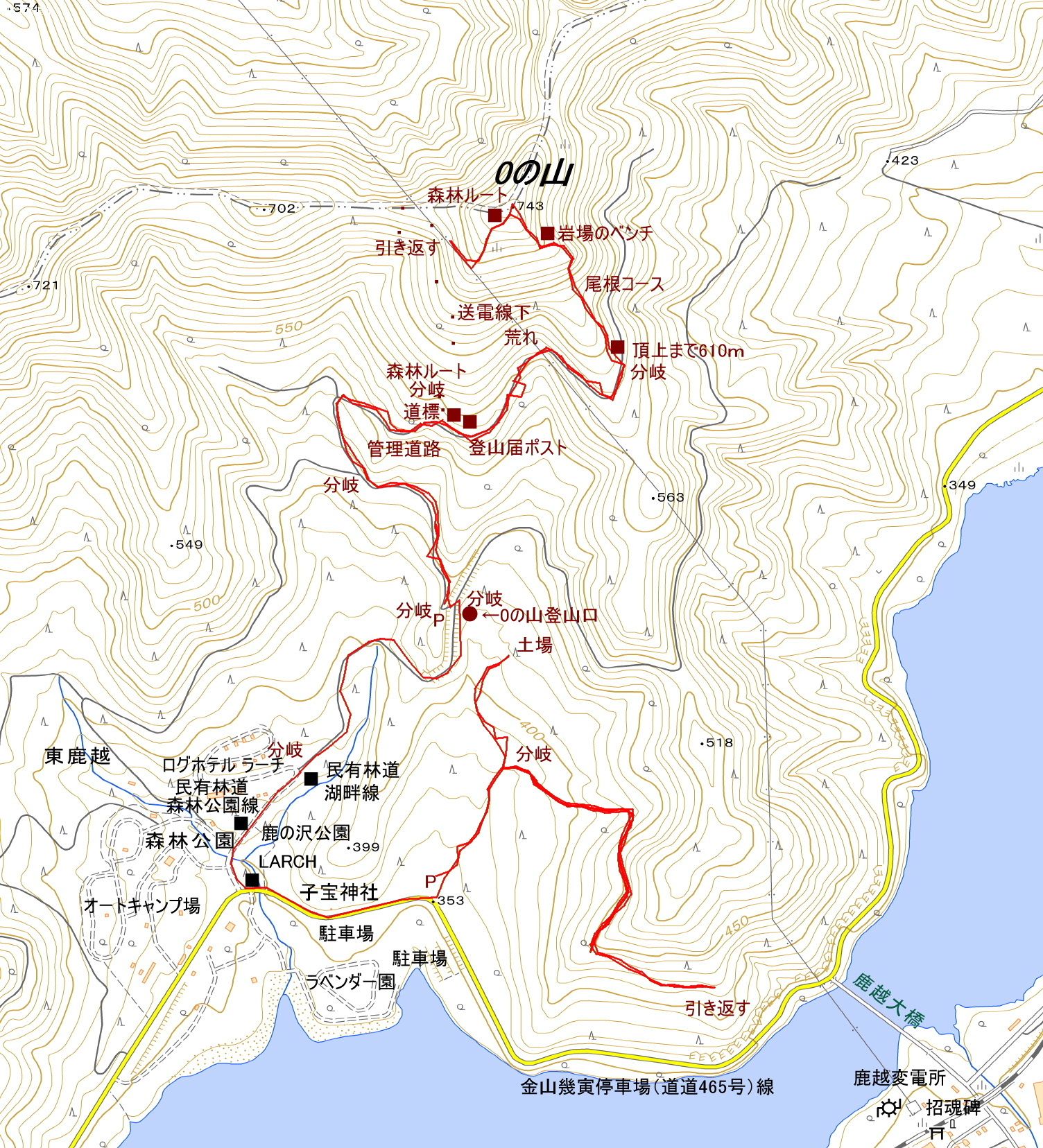 | アクセス 南富良野の金山湖畔北側を走る「道道465号線」沿いのログホテルラーチ(かなやま湖森林公園)を目指す。ログホテルラーチを左に見て民有林道「湖畔線」に入る。林道を奥へ進むと左に「0の山登山口」の標識と地図がある。左折すると今度は直ぐに右折になるが、今回は分岐に停めた(更に登山口まで車で行ける)。 |